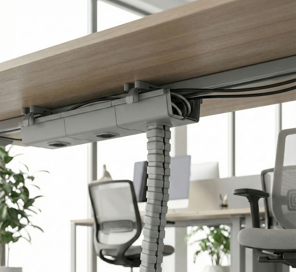 Flexible, enclosed vertical cable management—keeps cords tidy from desk to floor. The Cable Snake guides power, data, and low-voltage cables safely and neatly, ideal for both stationary and height-adjustable workstations in commercial environments.
