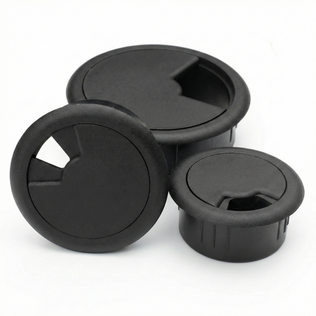 The Multi-Fit Wire Grommet is a 3-piece, configurable cable access solution designed to manage power, data, and low-voltage cabling at surface penetrations in desks, workstations, and custom furniture. Its adjustable top allows cables to feed through from any direction, offering precise control over the size of the opening.