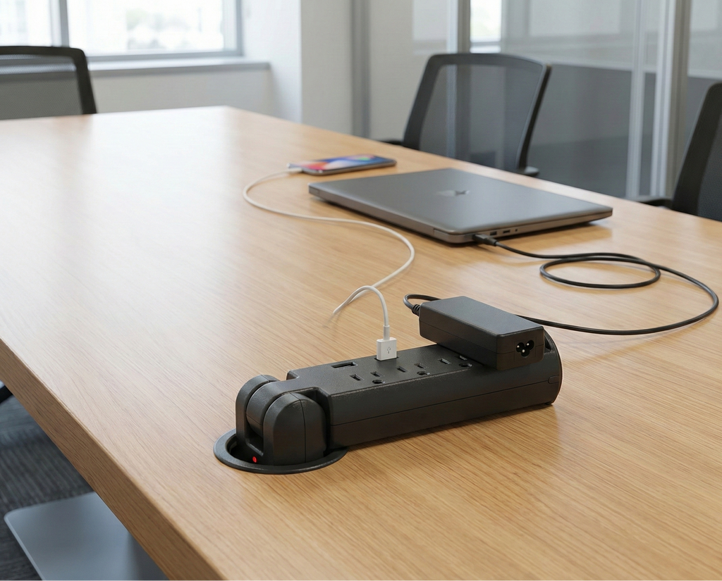 The Pull Up Power Grommet features an easy to use hide-away design allowing users to quickly and easily access both AC and USB charging ports. To access the power outlets, simply pull the unit up and it will lay flat allowing access to multiple power options. When not in use the unit sits flush with the work station. Ideal for conference rooms, workstations, hotel rooms, countertops, or anywhere else power access is needed.