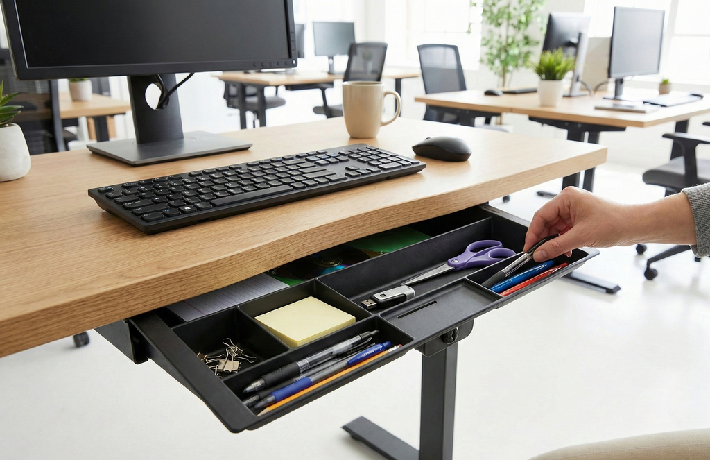 The Worksurface Utility Drawers are low-profile, under-surface storage drawers designed to keep desks organized without reducing leg clearance. With a slim 2″ profile, both the Wide and Narrow versions provide smooth, quiet operation using ball-bearing slides and feature ribbed compartments to keep contents in place. The Wide drawer offers deeper storage for larger items, while the Narrow drawer fits shallower desks and compact workstations. All units include mounting hardware and install easily under the worksurface.